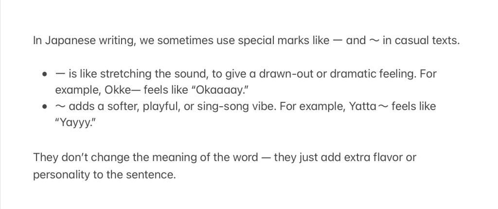 Also ー and 〜 carry sounds in Japanese, おっけ= okke, おっけー = okkeee, so something like “greatー” would sound strange. And ー is the same as kanji ー ( it means the number one, 1). It’s too complicated, I’m so sorry( ◠‿◠ )